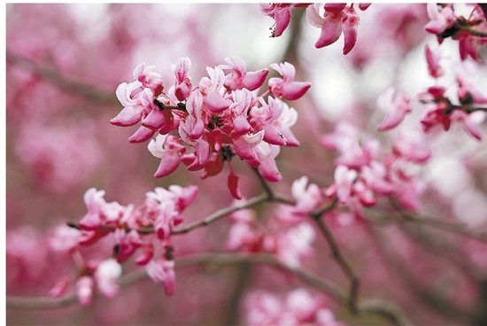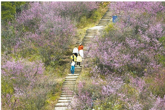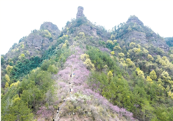 3月16日,许多市民在公婆岩登山。青灰色的台阶蜿蜒向上,两侧紫荆花密匝匝地盛放,粉紫的花瓣簇拥着枝杈,将丹霞岩壁晕染上温柔的色彩。眼下正是紫荆花的盛开期,若有闲暇,不妨踏上这条花径,在紫荆花海中邂逅春日的公婆岩。 融媒记者 卢斌 摄