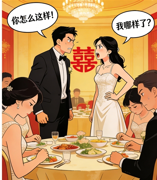 可不是嘛!更糟的还在后面。婚礼现场吃饭的时候,小峰和小菲居然还吵起来了,好好一桌人,气氛瞬间僵住。大家都尴尬得手足无措,只能低头闷吃。新娘看着,又急又无奈,本来满心想着招待好每一个人,结果闹成这样,真的太扫兴了。